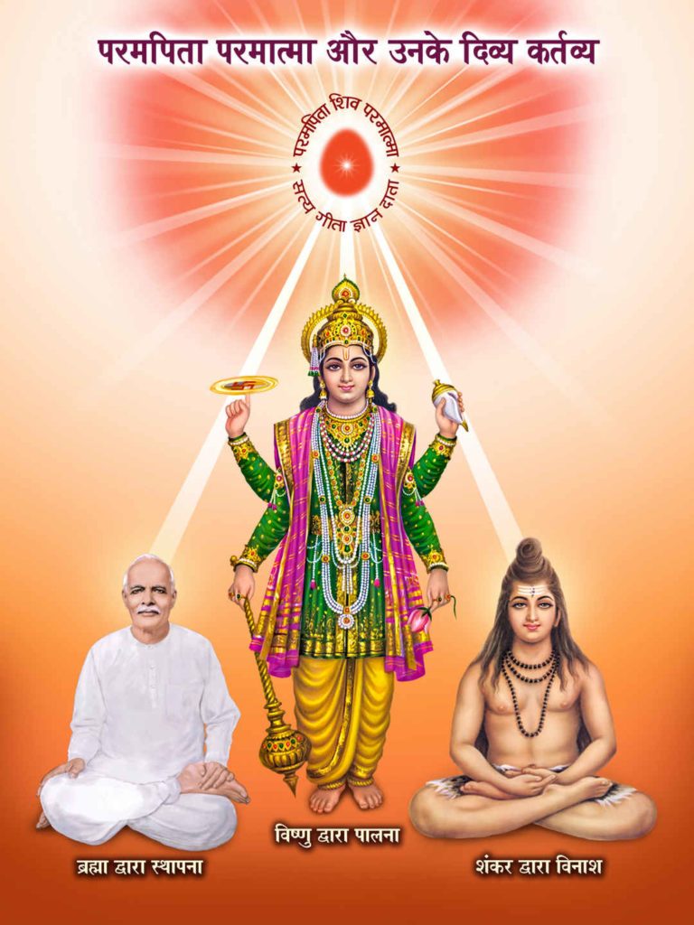 निराकार परमपिता परमात्मा शिव अपना दिव्य कार्य ब्रह्मा, विष्णु और शंकर द्वारा कराते है । ब्रह्मा द्वारा स्थापना, विष्णु द्वारा पालना और शंकर द्वारा विनाश